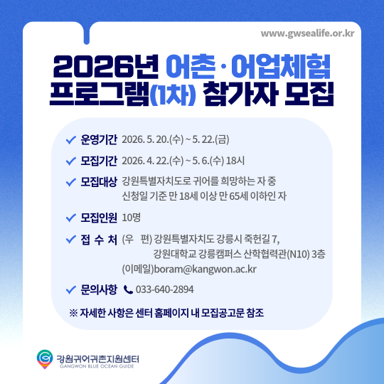 1) 항해사, 소형선박조종사, 동력수상조정면허, 무선통신사 등 어선어업과 관련된 자격증만 인정 2) 강원귀어귀촌지원센터 교육이수자는 가점 2점 부여 3) 정성평가는 사업 신청서의 자기소개서를 토대로 평가하고, 필요시 전화 면접 실시 ○ (선발안내) 2026. 5. 7.(목), 센터 홈페이지 및 개별 통보 ○ (접 수 처) 강원귀어귀촌지원센터 우편·온라인(이메일) 접수 - 우 편: 강원특별자치도 강릉시 죽헌길 7, 강원대학교 강릉캠퍼스 - 온라인(이메일) : boram@kangwon.ac.kr ○ (문의사항) 강원귀어귀촌지원센터(TEL 033-640-2894)